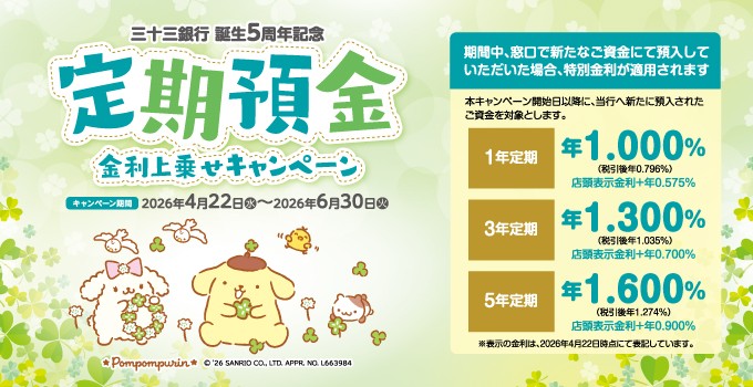 三十三銀行「合併1周年記念キャンペーン」実施のお知らせ
