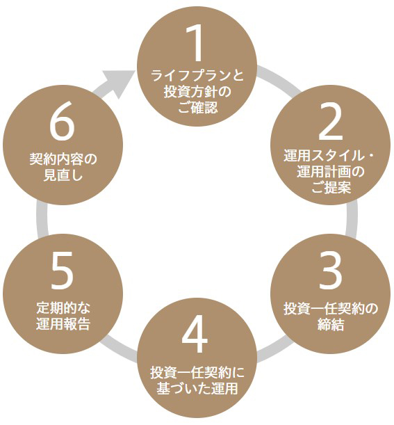 お客さまの投資方針のご確認、運用スタイル・運用計画のご提案、投資一任契約に基づいた運用の実行、定期的な運用報告等を通じた継続的なアフターフォロー・・・